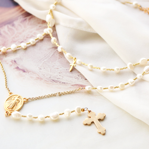 Crea bigiotteria davvero speciale per i momenti speciali da festeggiare o da ricordare! Aggiungendo simboli religiosi ai tuoi bijoux crei sempre una creazione unica per, ad esempio, battesimo, prima comunione, cresima o matrimonio! Per ispirazione abbiamo creato un bellissimo set di bijoux. I ciondoli di metallo di qualità designer nel color oro danno un effetto fantastico in combinazione con le perle d'acqua dolce. Con questi componenti puoi anche creare bellissimi bracciali e collane in stile rosario con ciondoli religiosi.