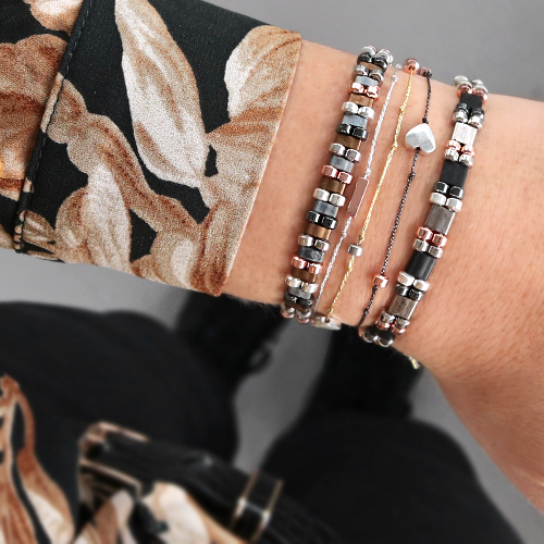 Creare bigiotteria con perline di ematite è facile e le possibilità sono infinite! Abbiamo scelto di creare bijoux in stile minimalista con le perline di ematite. Ad esempio, abbiamo abbinato le perline di ematite con filo di macramè metallico per un look scintillante e fantastica. Le perline Miyuki Tila sono anche ideali da utilizzare per creare braccialetti. Gli orecchini sono realizzati facilmente, utilizzando i nostri componenti di orecchini e abbinando le perline di ematite con perline sfaccettate. Buon divertimento!