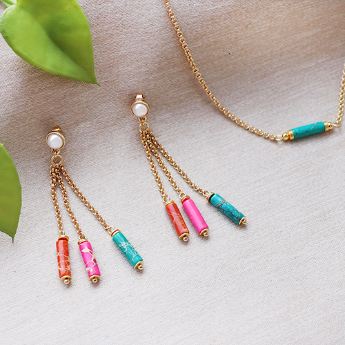 Queste perline in pietra naturale sono perfette da abbinare a vari tipi di collane. Ad esempio, puoi creare una collana di fili metallici colorati, alternando perline in pietra naturale e perle. Oppure realizzare una collana composta per metà da catene a rolò e per metà da perline in pietra naturale. Puoi creare orecchini fissando le perline tubo con un chiodino e una catena a rolò a un bellissimo orecchino di perla.