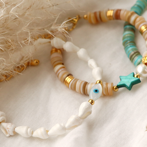 Le nuove perline di conchiglia sono proprio bellissime! Ci siamo lasciati ispirare da queste vivaci perline per poi creare gioielli estivi di vari stili. Per realizzare la collana e i bracciali abbiamo utilizzato la coda di topo e il filo metallizzato in base alle tecniche corrispondenti. Le perline di conchiglia si abbinano perfettamente alle perline e ai ciondoli di metallo DQ. Nel progettare i tuoi gioielli, pensa anche a combinare più perline di conchiglia di forme diverse, così saranno vivaci, unici e speciali. Vorresti realizzare un bracciale grintoso? Mettiti all’opera con la coda di topo, una perlina "occhio di Allah", perline di conchiglia e di metallo DQ. Ora tocca a te realizzare gioielli di tendenza! Buon divertimento!