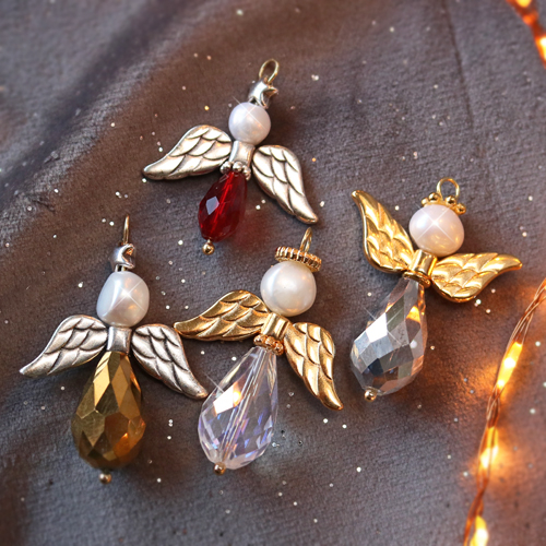 Realizzare angioletti portafortuna con componenti per gioielli può sembrare difficile, ma non lo è affatto! Siamo lieti di aiutarti e ti mostriamo ciò che ti occorre e quali angioletti potrai creare. Occorrente per realizzare gli angioletti: chiodini, Polaris Elements o perline a goccia sfaccettate, ali d’angelo in metallo DQ, perle d’acqua dolce o perline sfaccettate, rondelle strass o perline spaziatrici in metallo DQ, una pinza tronchese e una pinza a punta tonda. Per iniziare, infila sul chiodino una perlina a goccia e aggiungi poi gli altri elementi nell’ordine che preferisci. Per la testa puoi usare perle d’acqua dolce o perline sfaccettate, ma ovviamente anche altre. Quando hai finito, taglia il chiodino a circa 1 cm sopra l’ultima perlina. Piegalo con la pinza a punta tonda per creare un occhiello. E il gioco è fatto, buon divertimento!