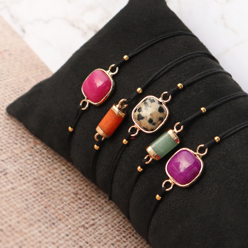 Cerchi ispirazione per la tua nuova collezione? Allora dai un’occhiata a queste idee per realizzare gioielli con la pietra naturale! Questa volta ci siamo messi alla prova con i nuovi meravigliosi distanziatori e pendenti in pietra naturale. Con questi fantastici articoli creerai in un batter d’occhio dei gioielli alla moda, ad esempio degli orecchini. Puoi scegliere di far brillare il pendente in pietra naturale fissandolo a un componente per orecchini. Ti piacciono i tuoi orecchini vistosi? Prova ad abbinare un distanziatore in pietra naturale a un ciondolo in pietra naturale oppure a un pendente in stile bohémien. Ti basterà appenderli uno sopra l’altro. Utilizzando colori accesi, non solo creerai un effetto uniforme, ma anche unico e speciale. Vuoi creare dei bracciali da abbinare? Realizza un braccialetto con la coda di topo e posiziona al centro un distanziatore in pietra naturale. Buon lavoro!