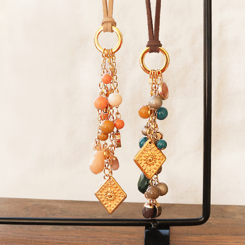 Le perline di vetro sono ovviamente dei veri e propri must-have, perché sono così versatili e possono essere utilizzate per qualsiasi cosa. Tuttavia, abbiamo scelto di creare veri bijoux in stile bohémien, ovvero due lunghe collane con orecchini abbinati. Le lunghe collane sono realizzate in pelle scamosciata finta e un anellino DQ. Li puoi appendere tutti i tipi di bellissime perline di vetro e altri oggetti, come il cristallo o le perline sfaccettate a forma di goccia, utilizzando una catena a rolò. Crea orecchini coordinati e la tua creazione è pronta!