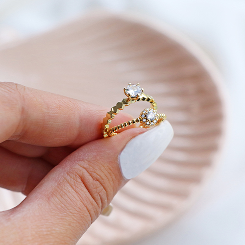 Questi anelli in ottone smaltati, in oro e argento, sono spiritosi da indossare, assieme agli anelli fatti a mano. Crea il tuo anello combinando, ad esempio perline rocailles, perline sfaccettate e perline in metallo DQ. Infilale sul filo di nylon o elastico e completa l’anello con un nodo e una goccia di colla. Usa un tappetino per perline quando utilizzi perline piccole.