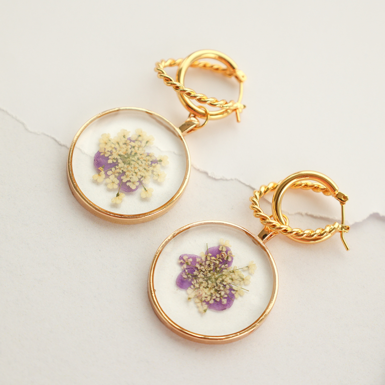 Bellissimi ciondoli e distanziatori con fiori secchi da inserire nella vostra prossima collezione di gioielli. I ciondoli e i distanziatori possono essere abbinati con catena a rolò e perle d'acqua dolce per creare i più bei gioielli primaverili.