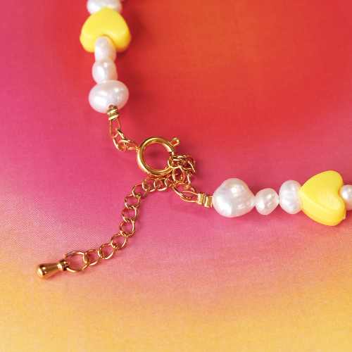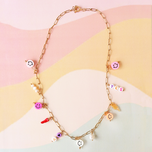 Hai voglia di realizzare gioielli super colorati e vivaci? Mettiti alla prova con la collezione di perline di polimero! Potrai creare queste collane di tendenza utilizzando la catena a rolò a maglie grosse, le perle d’acqua dolce di grandi dimensioni, le perline alfabeto in acrilico e ciondoli vari. Le perline di polimero sono coloratissime, ma le puoi comunque utilizzare per realizzare articoli davvero eleganti. Ad esempio, potresti creare un distanziatore con perle d’acqua dolce e una perlina di polimero. Per farlo puoi utilizzare un chiodino oppure puoi fissare un pezzo di filo metallico a entrambi i lati della catena a rolò. Dopodiché, crea una catena a rolò fissando vari ciondoli al gioiello. Che ne diresti di un bel ciondolo a forma di peperoncino? È facile trasformare le perline di polimero, come ad esempio gli smiley, in un ciondolo utilizzando un chiodino. Divertiti con questi simpatici articoli e libera la tua creatività!