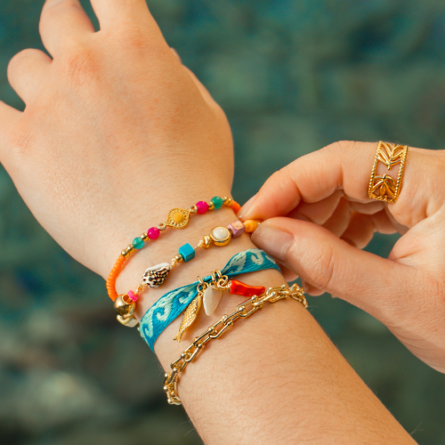 Colore, colore e ancora colore! È il tema di questa tendenza. Combina tra loro più colori e materiali per un effetto sorprendente. Crea bracciali e collane con varie perline come quelle in acrilico, in pietra naturale, in ceramica e millefiori. Puoi creare orecchini coordinati infilando le stesse perline su un orecchino a cerchio. Gli anelli colorati pronti da indossare possono essere indossati assieme agli anelli fatti a mano di filo elastico e perline, per un look favoloso!
