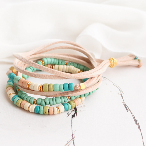 Con le perline di cocco crei bijoux con un aspetto naturale e un tocco bohémien. Infila vari colori delle perline di cocco sull'elastico e abbinalo con le perline di metallo DQ per un effetto giocoso nei braccialetti. Puoi anche infilare le perline su un chiodino a occhiello e incorporarlo in un braccialetto avvolgente con cordoncino scamosciato finto. Anche gli orecchini con perline di cocco sono molto divertenti da creare. Appendi al componente dell'orecchino il tuo ciondolo, ad esempio, a forma di un semicerchio. Attorno ad esso puoi quindi attaccare le perline di cocco avvolgendole con Artistic Wire. Un altro consiglio è quello di infilare le perline sugli orecchini a cerchio. Appendi il tuo ciondolo preferito e attacca un cabochon sul perno dell'orecchino. Buon divertimento!