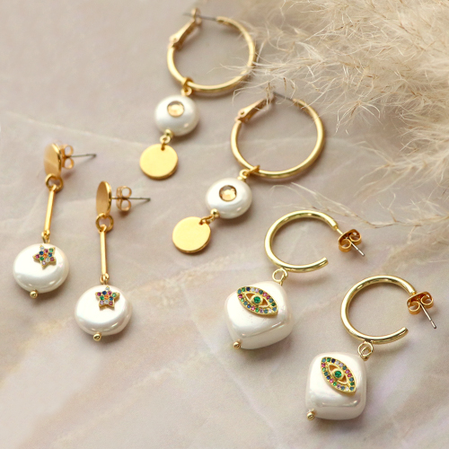 Mettiti alla prova e realizza gioielli di tendenza con gli articoli di conchiglia effetto perlato insieme agli elementi in ottone con zirconie.