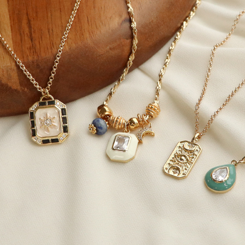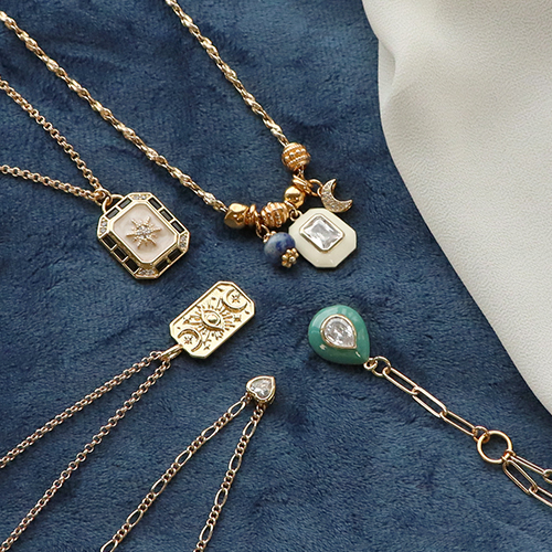 Questi ciondoli e perline in ottone con zirconia sono perfetti per creare una collezione di collane a strati. La tendenza è quella di indossare più collane della stessa lunghezza una sopra l'altra. Crea delle collane con vari tipi di catene a rolò a cui appendere i ciondoli. Indossa collane con varie perline come Katsuki, perline sfaccettate, perline in pietra naturale e perline Polaris a rondella.